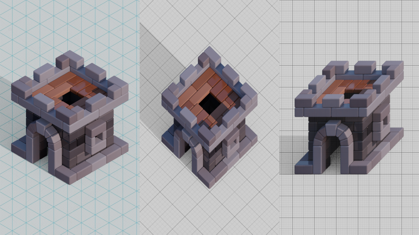 Oblique projections cannot be created simply by the pointing the orthographic camera in the right direction. If you look at the middle and right images in the thumbnail, you'll see that one side of the cube-castle appears as a square, and yet two other sides are still visible. This tutorial explains how to render the three projections on the thumbnail.