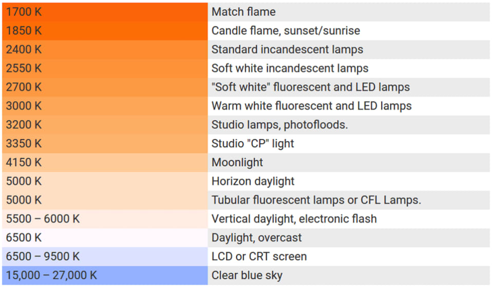 To create these physically accurate colors, Blender has a built-in Blackbody node that outputs color based upon the Kelvin color temperature scale. Kelvin is one of the most commonly used units for color temperature, so it's quite easy to find a reference for whatever lightings you're trying to create. To make things easier, here's a reference sheet from Wikipedia for some common temperature values.